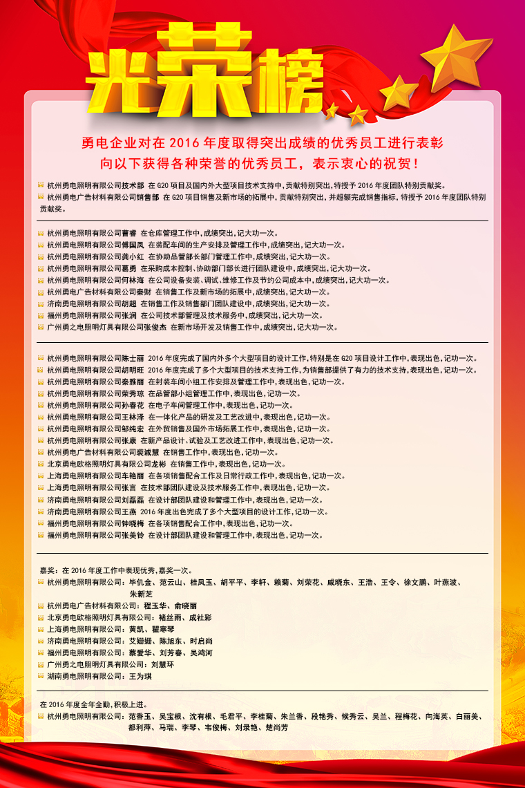 勇電照明2016年度優(yōu)秀員工榮譽榜出爐