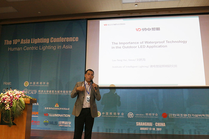 會上,勇電智能照明研究所副所長、外國專家Steve Lau以《防水技術(shù)在戶外LED應(yīng)用中的重要性》為主題,向參會人員講述了勇電二次封裝LED燈具高達(dá)IP68的防水性能,是如何有效抵擋住了戶外潮濕環(huán)境的侵蝕,并在現(xiàn)場通過視頻的形式展現(xiàn)了近年來勇電燈具應(yīng)用在國外項(xiàng)目上的經(jīng)典案例。除此之外,會議期間,Steve Lau專家多次與各國專家學(xué)者就光生物安全與光對人體生理時鐘的影響等問題進(jìn)行了深入的探討與交流。