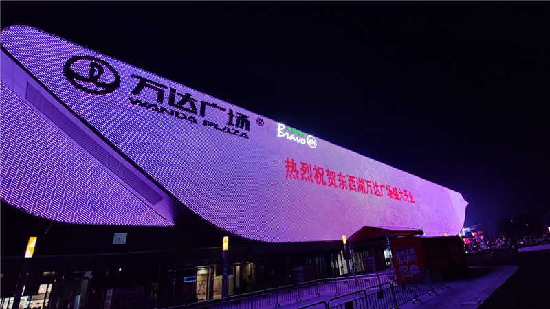 東西湖萬(wàn)達(dá)廣場(chǎng)夜景照明以現(xiàn)代大氣為理念,結(jié)合立面漸變的網(wǎng)格肌理,采用勇電LED點(diǎn)光源運(yùn)用于戶外景觀照明,打造了一塊面積達(dá)5500㎡的戶外媒體屏。