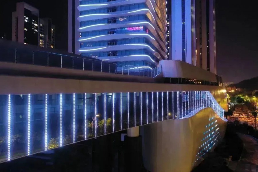 寧德華僑大廈建筑立面呈波浪狀,燈具沿著建筑立面細(xì)窄外沿進(jìn)行細(xì)致勾勒,在確保夜晚”海浪波濤“的燈光效果符合城市文化底蘊(yùn)、提升城市形象的同時(shí)不破壞建筑白天簡潔、律動(dòng)的建筑風(fēng)格。